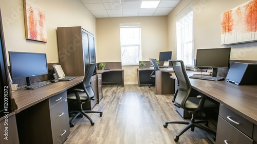 The office is equipped with multiple workstations, each featuring a computer, chair, and personal storage.