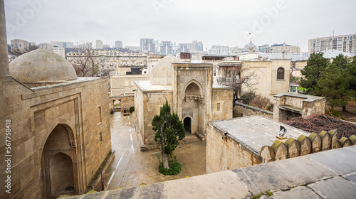 The old town of Baku city center during a cloudy raining day. Travel to Azerbaijan. Fortress architecture buildings.