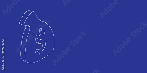 The outline of a large bag of money symbol made of white lines on the left. 3D view of the object in perspective. Vector illustration on indigo background
