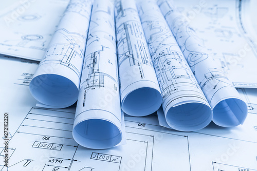 The part of engineering project. Workplace with blueprints.