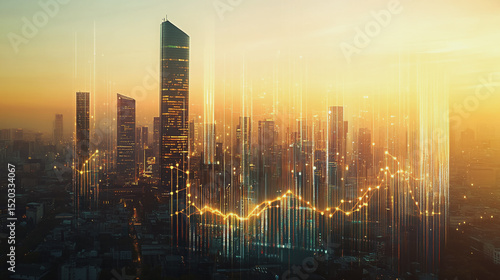 the peak of success amid tall, innovative Smart city and graphs with statistics to analyze business potential and predict future developments in company growth., innovative