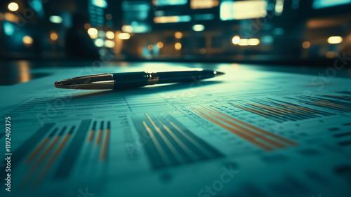 The Pen is Mightier: A gleaming pen rests on a stack of charts and graphs in a dimly lit office, suggesting the power of thought, analysis, and strategic planning.