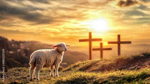 The poignant scene of a lamb in front of the three crosses at Calvary.