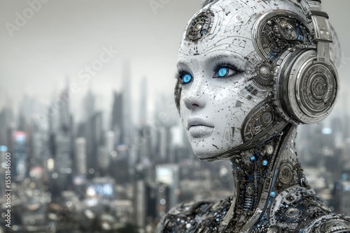 The portrait of a modern robot illustrates the concept of the human face being a job, shaped by the evolution of modern technologies and robotics