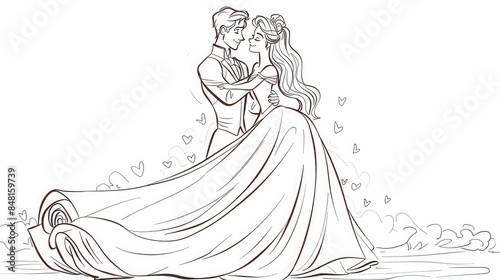 The princess and prince show their love with cartoon lines in full length on a white background used for teaching and coloring. Generative Ai