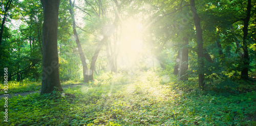 The rays of the sun through the branches of trees. Morning in the forest. Spring or Summer