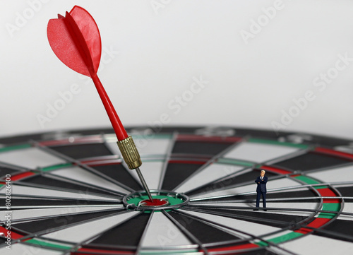 The red dart arrow in the middle of the dart paper is the goal of the business. An entrepreneur looking at arrows on a dartboard. Concept of business marketing plans and objectives.