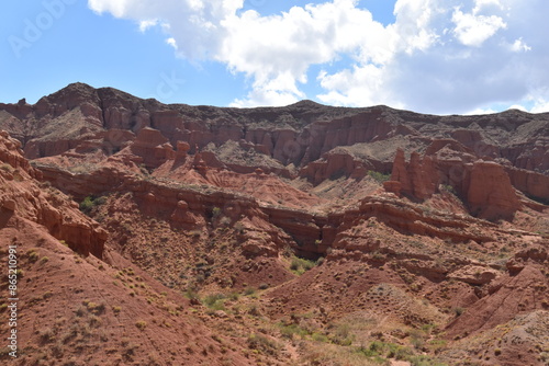 The red sandstone cliffs, canyons and valleys of Kyrgyzstan in Central Asia