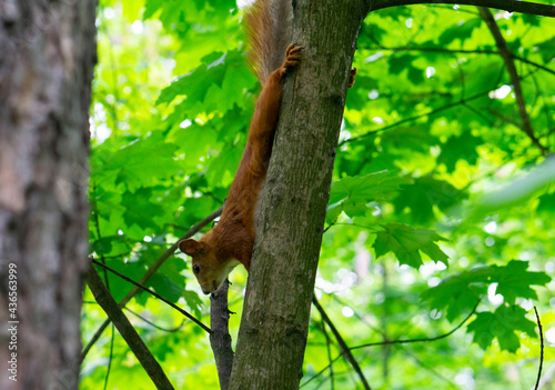 The red squirrel or Eurasian red squirrel (Sciurus vulgaris) is a species of tree squirrel in the park. Bright green leaves background.
