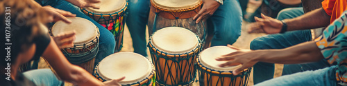 The Rhythm of Kinship: A drum circle with people from different backgrounds playing together in harmony.