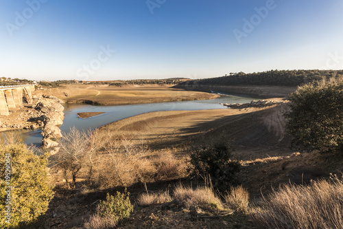 The Ricobayo reservoir (Embalse de Ricobayo) and the Puente de la Estrella arch bridge over the Esla river in Zamora, Castile and Leon, Spain. Almost dried during winter 2018