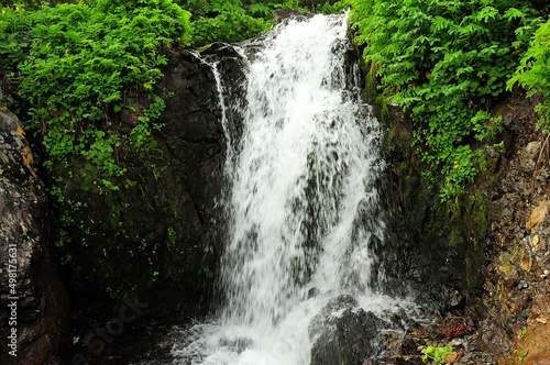 The river stream flows like a stormy waterfall from the rocky slope of the mountain overgrown with small shrubs.