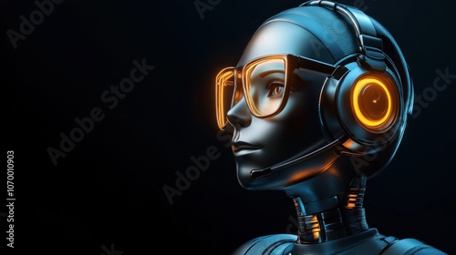 The robotic assistant features sleek black design and glowing orange accents, wearing headphones and looking confidently ahead as it engages in virtual communication in a dimly lit space