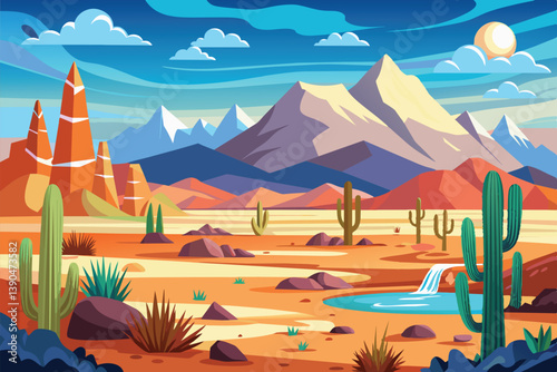 The scene features a striking desert with red rock formations, tall cacti, and a gentle stream flowing amidst a backdrop of majestic mountains, all under a brilliant blue sky.