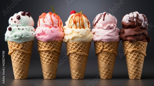 The scoop of ice cream is on top of a waffle cone. Many assorted different flavour Mockup template for artwork design