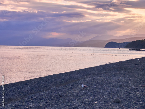 The sea and the pebbly shore are illuminated by the setting sun, the cloudy sky is colored by the sunset light, a lonely seagull is walking along the shore