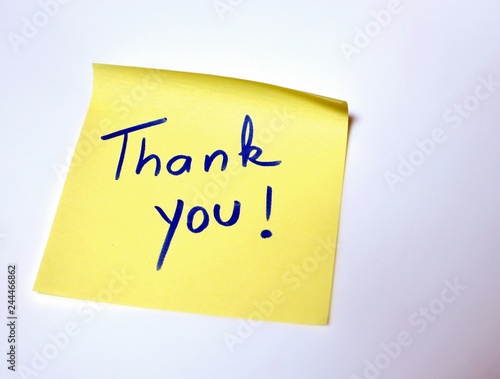 The sentence Thank you written by hand on a yellow post it and put on the white table