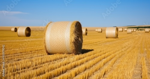 The Serene Beauty of Hay Bales Lying in a Field on a Bright Day. Generative AI