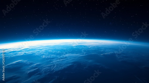 The serene view of Earth's horizon seen from space, with a soft glow of blue atmosphere and distant stars sprinkled across the vast universe.