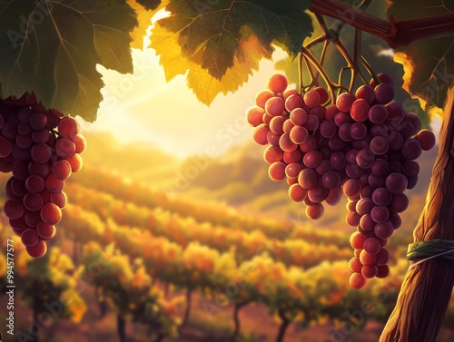 The setting sun is filtered through the vines, ripe grapes hang from the vines, and the scene is serene and peaceful.