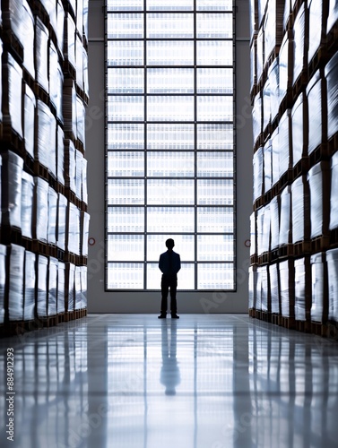 The silhouette of a manager in a large warehouse filled with cargo highlights the efficiency of logistics operations. The image is designed with generous copy space for various uses.