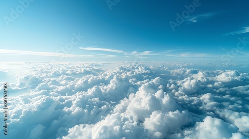 The sky seen from an airplane window, with clouds below and a boundless expanse above, provides a new perspective on our world and its possibilities.