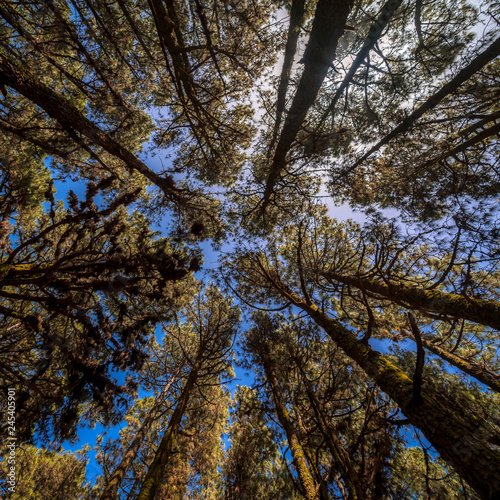 The sky through relict pines in the highland forest (more than 2000 meters). Tenerife. Canary Islands. Spain.