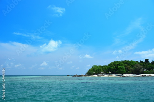 The small island has white beaches. Clear water and blue sky
