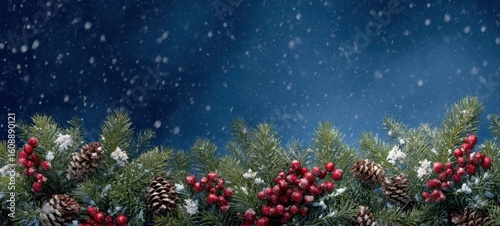 The snow-covered pine branches with vibrant red berries create a festive holiday scene.