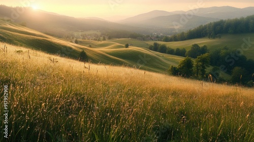 The soft light of sunrise illuminating the grassy hills of the Carpathians, with morning dew sparkling on the blades.