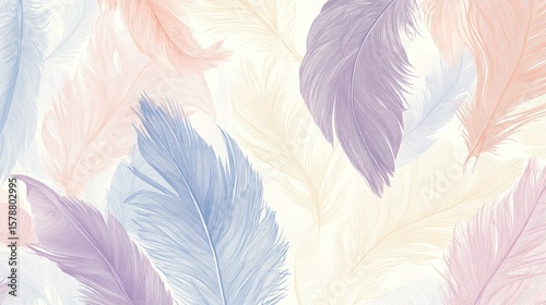 The stock photo shows a seamless texture of soft pastel hand-drawn feathers.