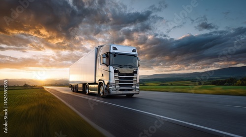 The stunning silver truck cruising along a picturesque highway at sunset.