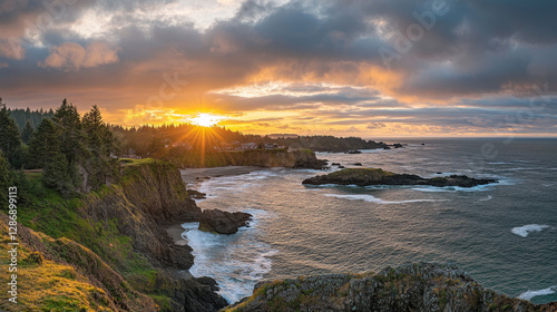 The sun setting over the Pacific Ocean as seen from Depoe Bay, Oregon