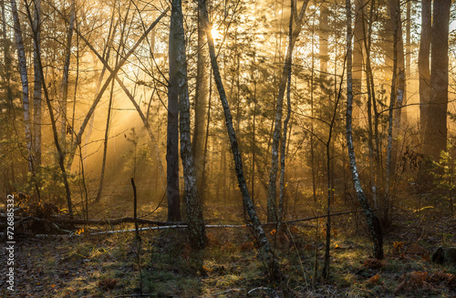 The sun's rays break through tree branches and slight fog. Sunny morning in a forest or park. Walk in nature.