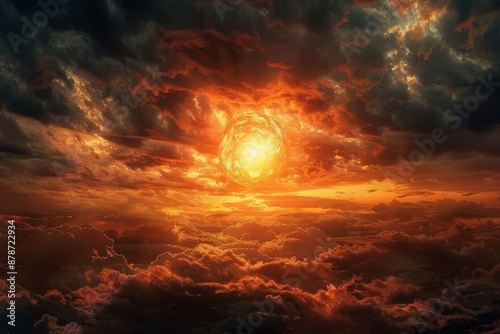 The suns rays pierce through billowing clouds in the sky, Construct a hauntingly beautiful image of a piercing sunset