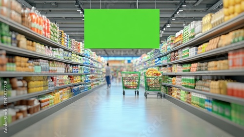 The supermarket aisles are lined with neatly stacked shelves of groceries and colorful packaging. A large, blank green billboard sits above background AI generated image