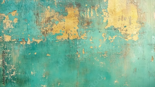 The surface details a blend of distressed green and gold tones, revealing layers of peeling paint and texture that evoke a vintage feel