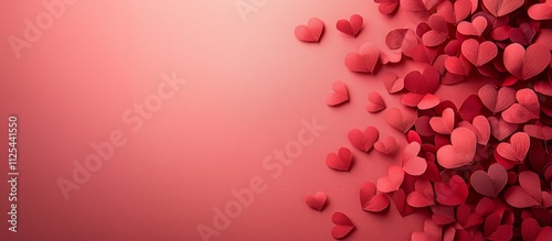 The surface is pink, partially covered with voluminous paper hearts of a rich red hue. Copy space.