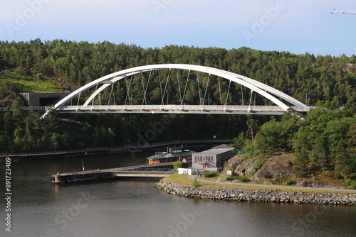 The Svindersvik Bridge (Svindersviksbron) between rocky shore of Svindersviken, a bay of Saltsjön in Södermanland, linking Kvarnholmen peninsula to the centre of Nacka, just south of Stockholm, Sweden