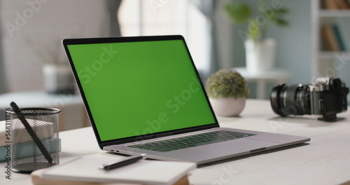 The table of distant worker at home. Modern laptop computer with chroma key green screen. Remote work, distance learning, technology concept close up
