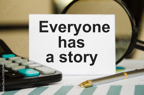 the text everyone has a story written on a white piece of paper with a calculator and financial statements