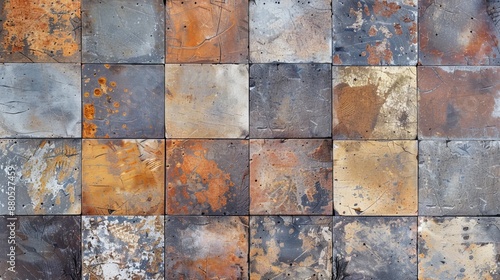 The texture is an old brown gray rusty vintage worn shabby patchwork motif tiles combined with a stone concrete cement wall texture for the background banner.