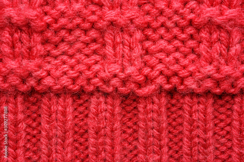 The texture of a knitted sweater. Red pattern. Facial surface. Background. Copy space