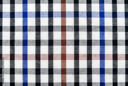The texture of linen fabric in a large cell of black, blue and white. Scottish tailoring material. checkered fabric