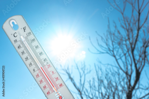 The thermometer lies on the snow and shows a negative temperature in cold weather on the blue sky.Meteorological conditions with low air and ambient temperatures.Climate change and global warming