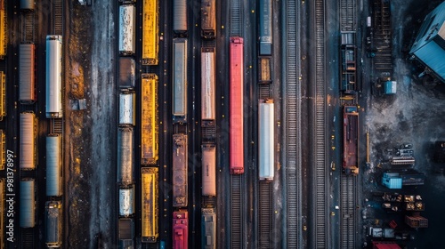 The train yard features an array of colorful freight cars arranged neatly on tracks, surrounded by industrial structures, illustrating a lively transportation hub