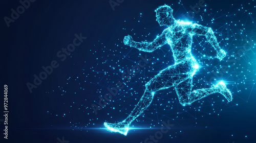 The vector illustration features a digital running man in motion, set against a futuristic technological blue background. The athlete’s silhouette is composed of scattered particles, points, lines, an
