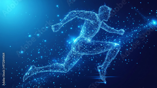 The vector illustration features a digital running man in motion, set against a futuristic technological blue background. The athlete’s silhouette is composed of scattered particles, points, lines, an