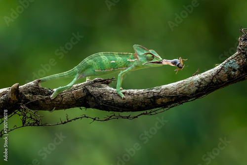The Veiled Chameleon is catching its prey with its tongue in the rainforest of Java, Indonesia.
