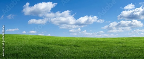 The Vibrant Green Field under a Bright Blue Sky with Fluffy Clouds